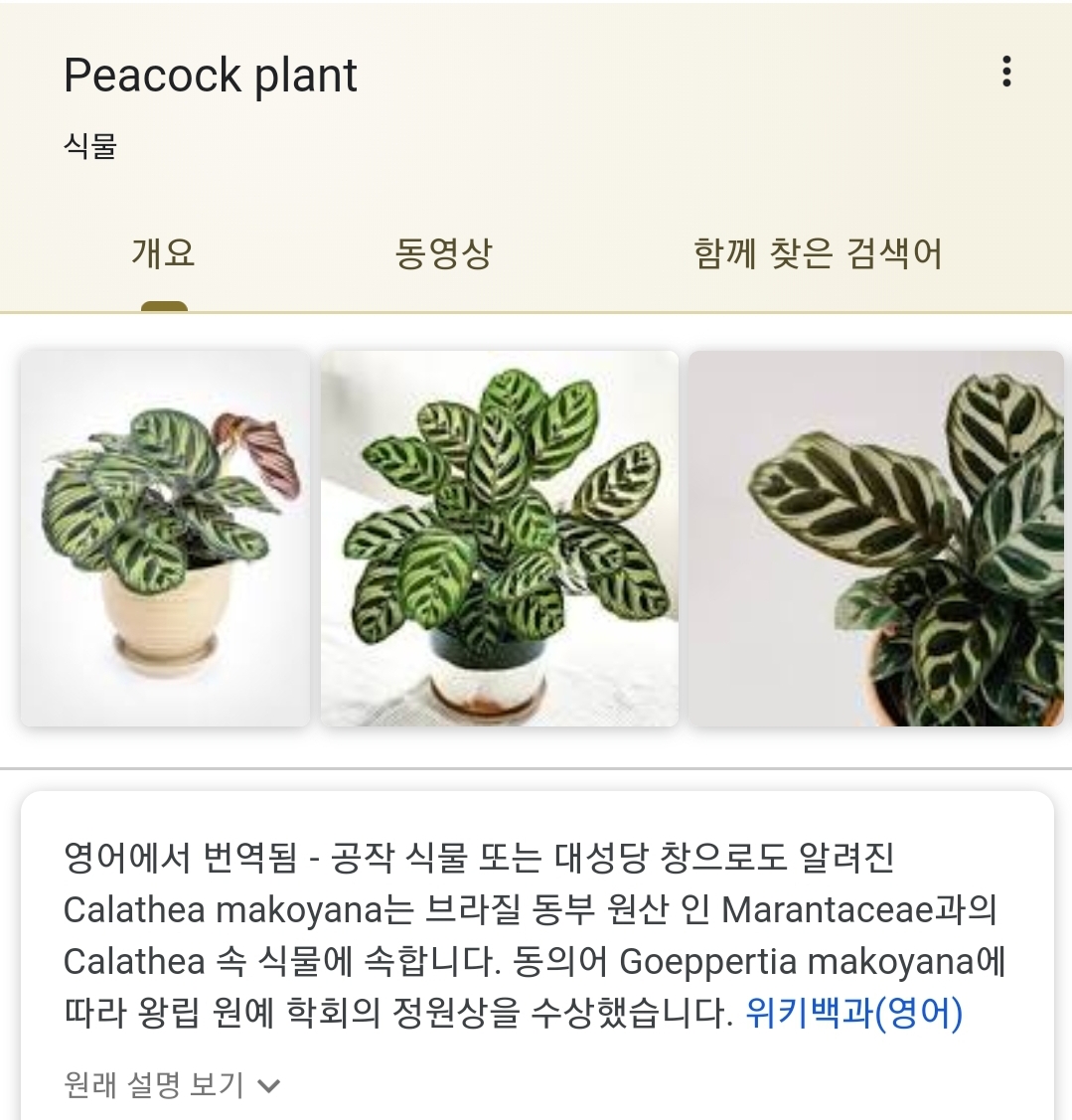 칼라데아 마코야나는 브라질이 원산인 마란타과의 열대식물로 잎의 무늬가 마치 공작새의 깃털을 닮았다고 하여 영명으로는 공작나무(peacock plant), 또는 화살깃파초라는 이름으로 불린다고 합니다.