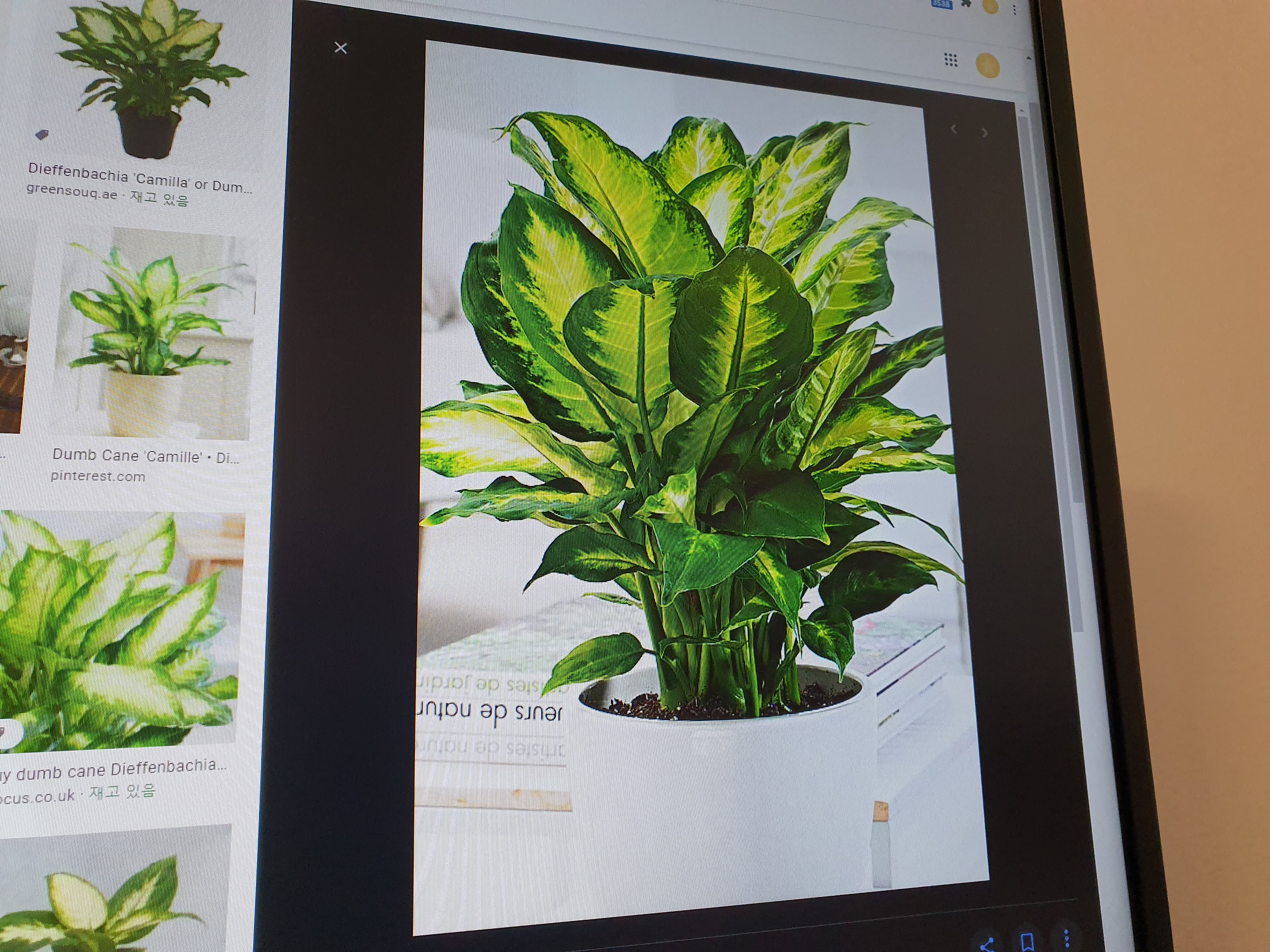 디펜바키아 카밀라는 마리안느(Marianne)라는 이름으로도 통용되고 있습니다. 디펜바키아 종류는 수액에 옥살산칼슘이라는 성분이 들어 있어 입에 물고 씹으면 말을 할 수 없을 정도로 목이 붓는다고 하여 'dumb cane'이라고 불립니다. 그래서 실내에서 키우게 되면 애완동물이나 어린 아이들이 먹지 않도록 주의할 필요가 있다고 해요. 톨루엔이나 키실렌 등 유해물질을 제거하는데 탁월한 효과가 있다고 합니다.