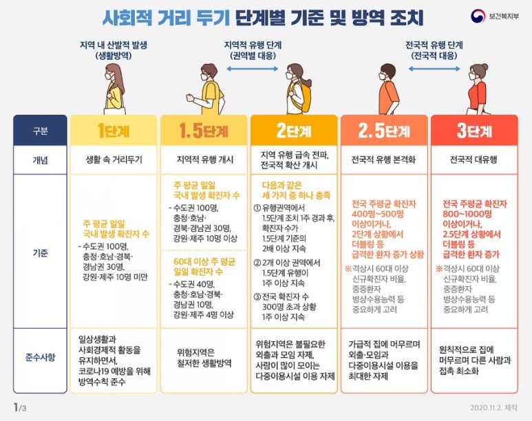 특히 11월 21일부터 11월 27일까지 최근 1주일간 지역발생 확진자는 하루 평균 382.7명으로 집계되어 전국 2.5단계 기준에 가까워지고 있다는 것인데요. 사회적 거리두기 2.5단계 기준은 일 확진자 400~500명 이상 또는 '더블링' 등 급격하게 증가할 때 입니다.