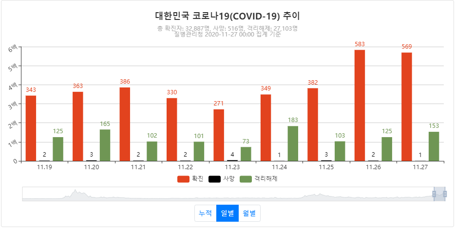 특히 11월 21일부터 11월 27일까지 최근 1주일간 지역발생 확진자는 하루 평균 382.7명으로 집계되어 전국 2.5단계 기준에 가까워지고 있다는 것인데요. 사회적 거리두기 2.5단계 기준은 일 확진자 400~500명 이상 또는 '더블링' 등 급격하게 증가할 때 입니다.