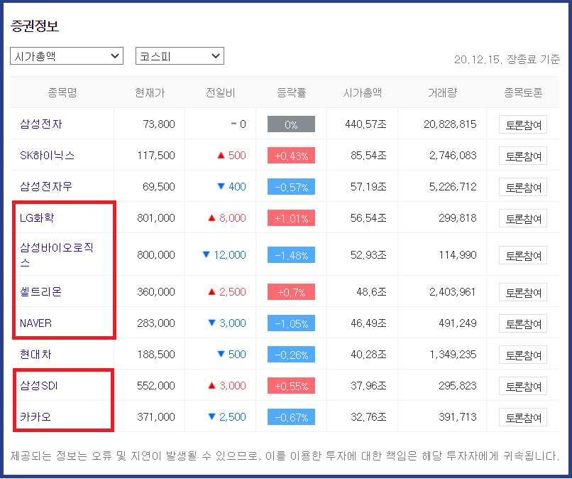 BBIG의 성장세로 올해 전통적으로 유지되어 왔던 시총순위도 많이 바뀌었습니다. 현재(20년 12월 15일 기준) BBIG7 중에서 LG화학, 삼성바이오로직스, 셀트리온, NAVER, 삼성SDI, 카카오 이렇게 6개의 종목이 코스피 시총 순위 10위 안에 모두 들어가있을 정도죠.