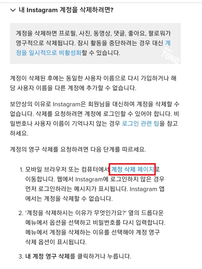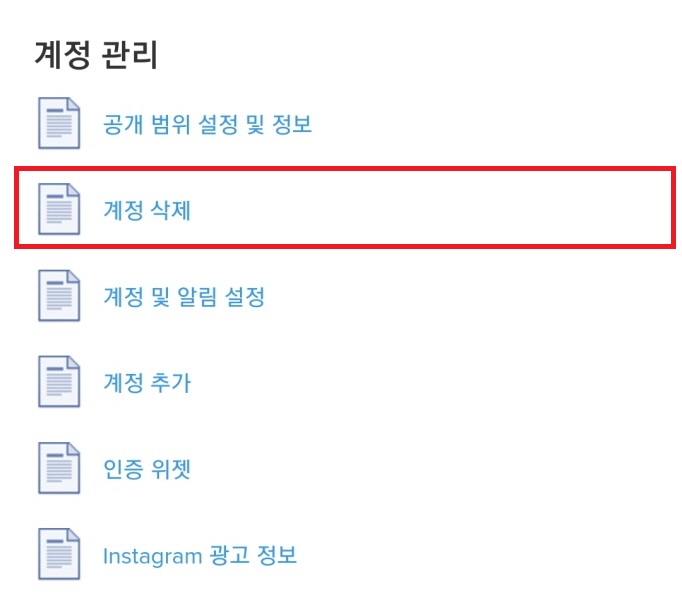 이 긴 글에서 <계정 삭제 페이지>라는 파란색 문구를 찾아서 눌러줍니다.