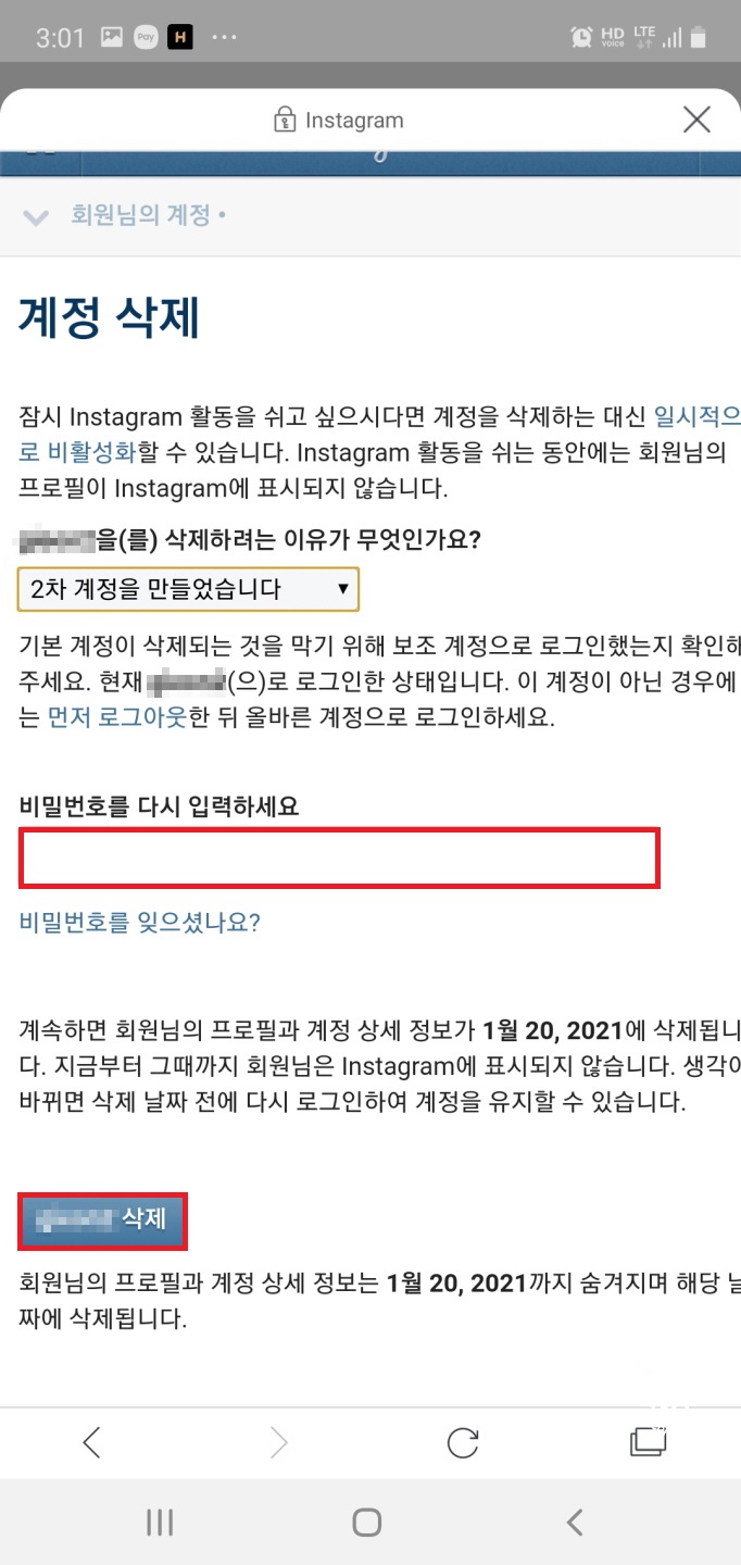 계정 삭제 마지막 단계에서 다시 비밀번호를 입력해야 해서 비밀번호를 숙지하고 있어야 하거든요.