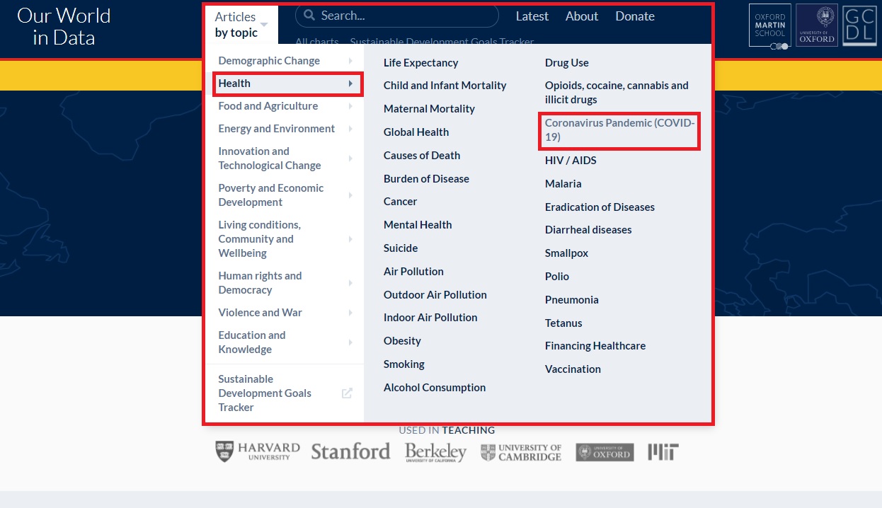 오늘 확인할 통계는 코로나19 관련 통계이므로,상단에 있는 [Articles by topic] - [Health] - [Coronavirus Pandemic(COVID-19)] 항목으로 들어갑니다.편의를 위해 아래에 링크를 남겨둘게요.