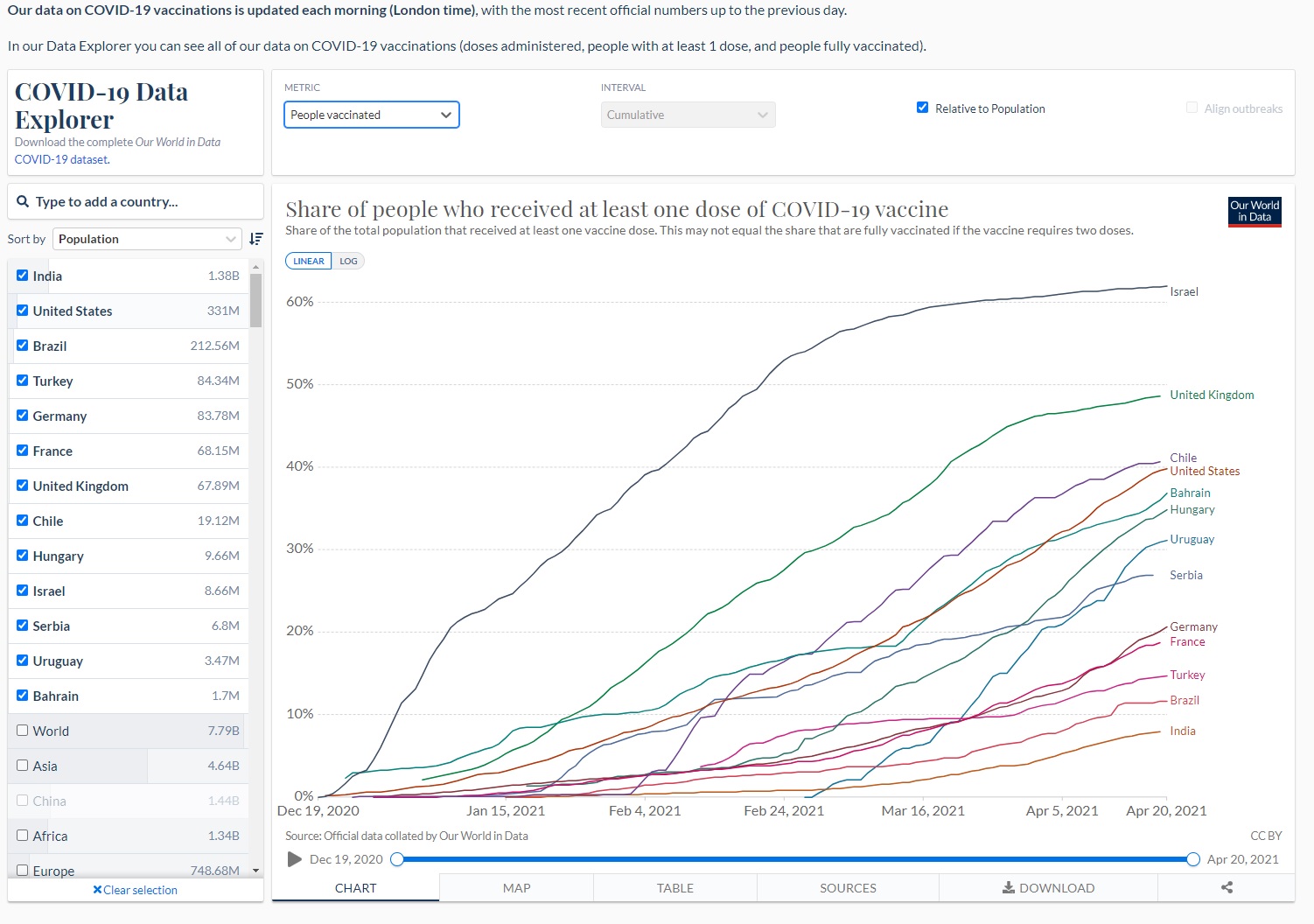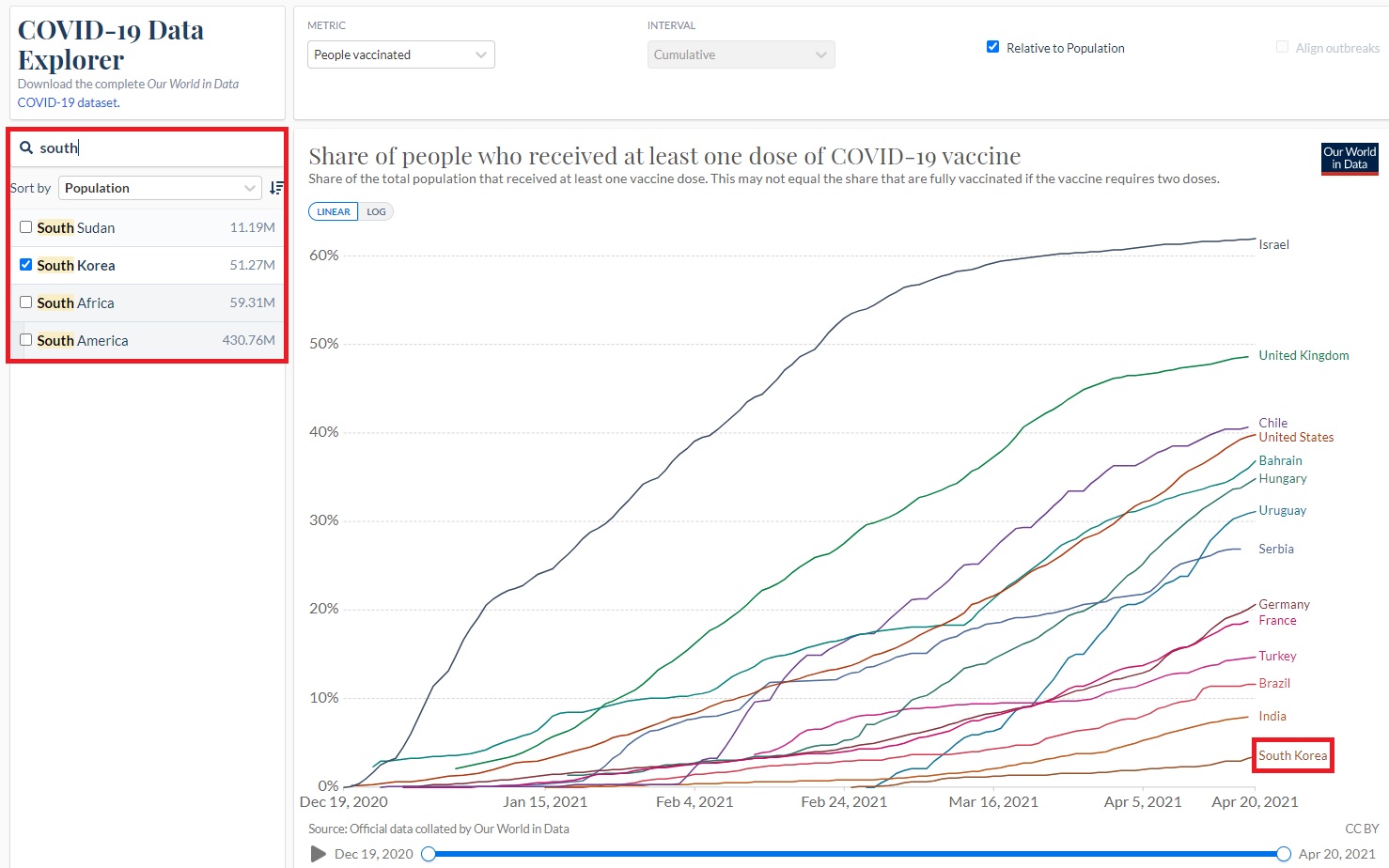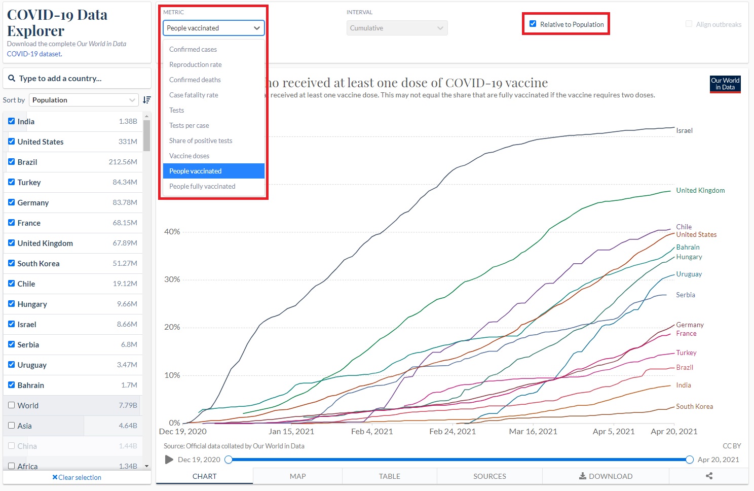 그리고 오른쪽에 'Relative to population' 체크박스를 해제하시면,인구당 비율이 아닌 숫자 통계도 확인이 가능합니다.