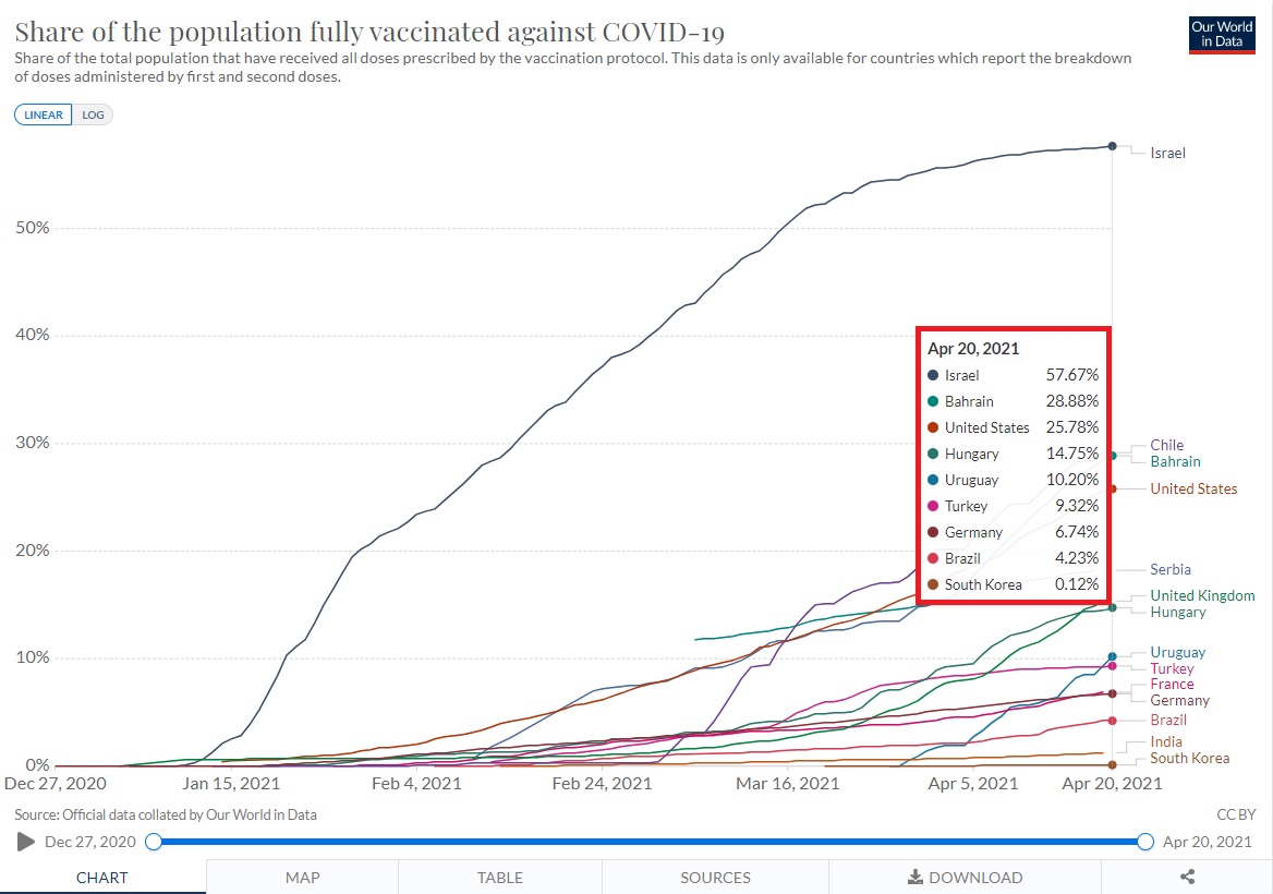 집단면역에 가까워지고 있는 이스라엘의 백신접종률은 전체 인구의 약 58%,우리나라의 경우는 아직 0.12%에 머물러 있습니다.1차 접종까지 마친 사람은 3.5%로 정도 되네요.