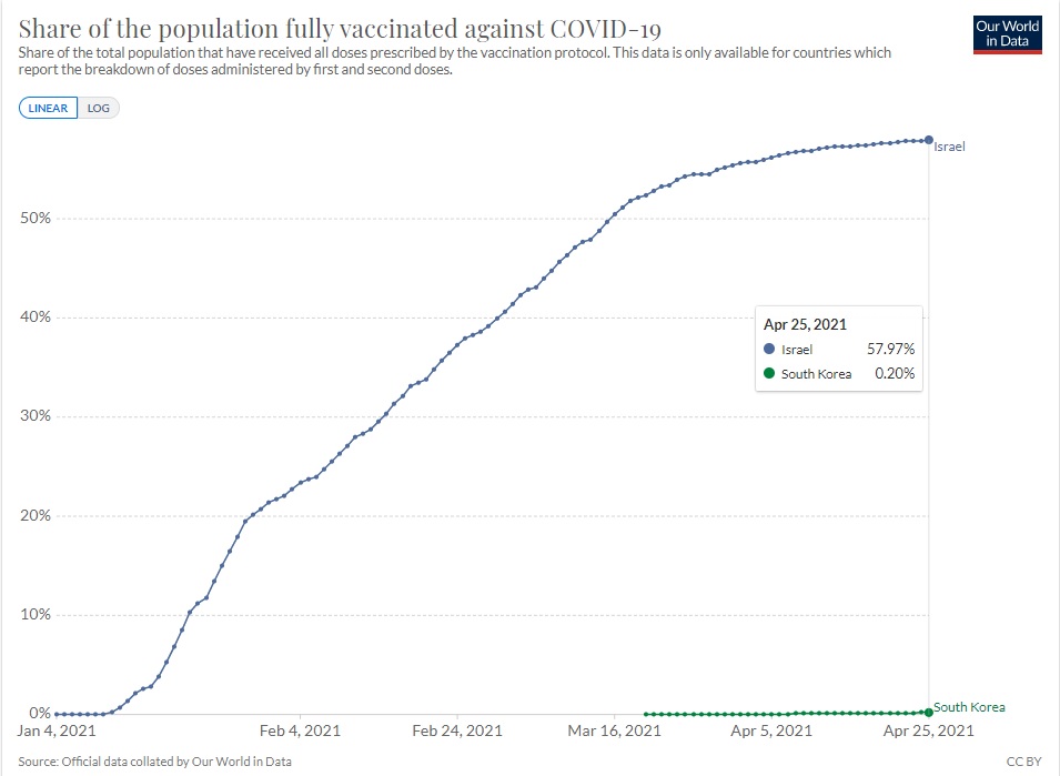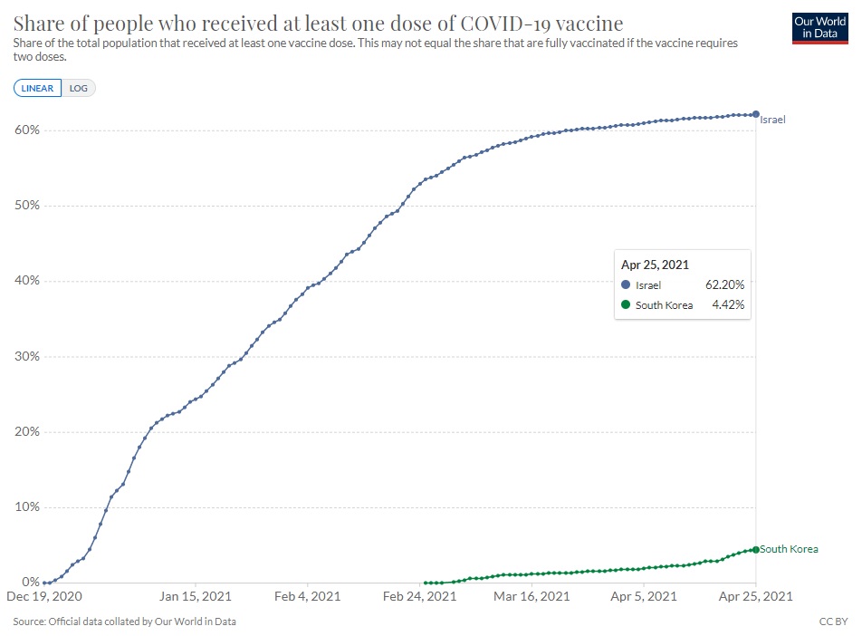 4월 25일 기준, 이스라엘은 전국민의 약 62%, 대한민국은 약 4.5%가 백신접종을 마쳤습니다.
