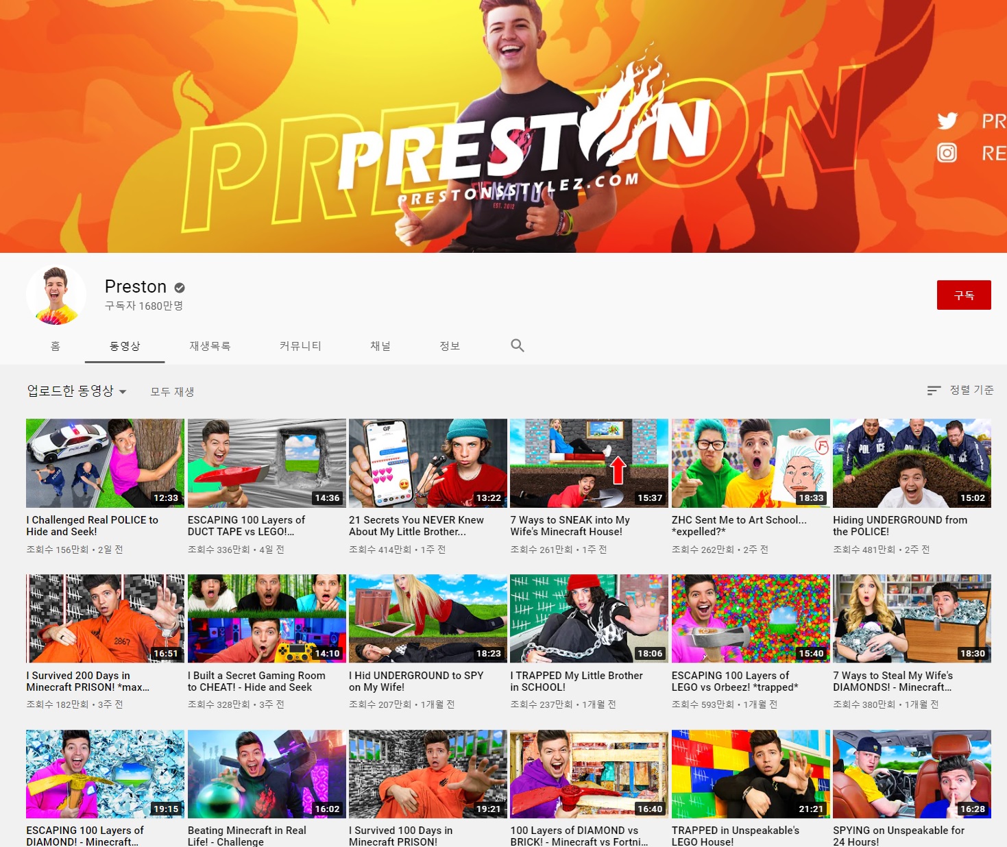 게임 마인크래프트가 주 컨텐츠인 게임 유튜버 'Preston'이 6위입니다. 아직도 많은 유저수를 자랑하는 마인 크래프트이기 때문에 게임 유저들에게 많은 사랑을 받고 있는 채널인듯 해요. 최근 영상에서는 마인크래프트를 현실에 적용한 컨텐츠를 주로 올리고 있습니다. 약 1680만명의 구독자를 보유하고 있습니다.