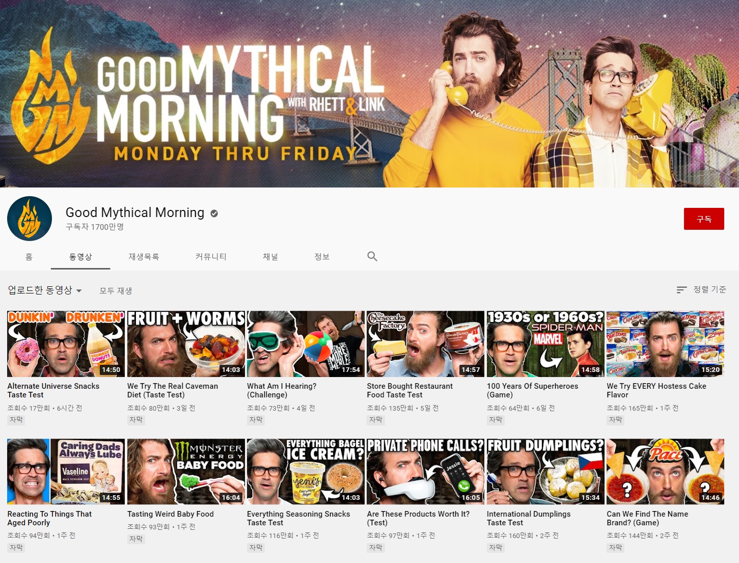 4위는 2012년부터 시작된 유튜브 채널인 'Good Mythical Morning'입니다. 렛(Rhett McLaughlin)과 링크(Link Neal)이 세계의 다양한 음식을 맛보고 소개해주는 채널로 현재 약 1700만명의 구독자를 보유하고 있습니다. 2020년 'Good Mythical Morning'에서 진행한 '최고의 인스턴트 라면'에서 농심 신라면이 1위를 달성하기도 했었죠.