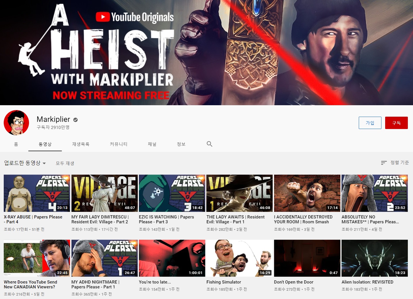 5위는 해외 게임 유튜버인 'Markiplier'입니다. 우리나라 유튜버 중에서도 많이 찾아볼 수 있는 유형의 게임 유튜브로 다양한 게임을 직접 플레이하며 소개해주는 채널입니다. 무려 2910만명의 구독자를 보유하고 있습니다.