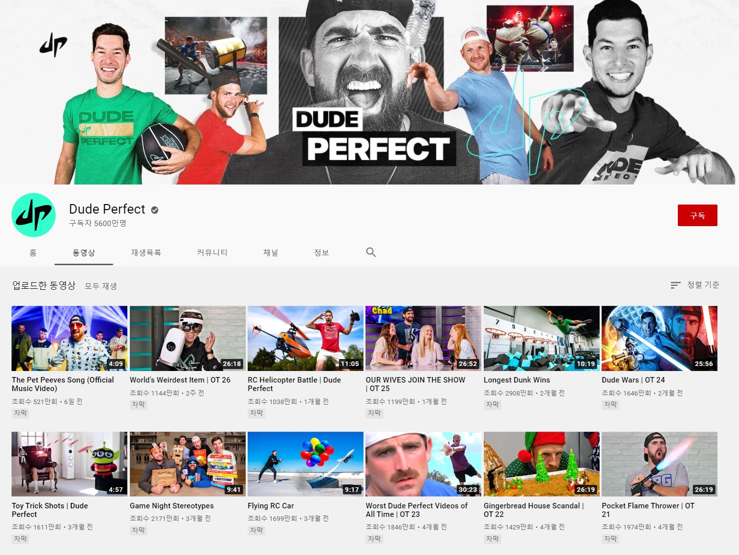 3위는 5인조 그룹으로 활동하고 있는 유튜버 'Dude Perfect'입니다. 듀드 퍼펙트는 축구, 미식축구, 탁구 등 다양한 스포츠를 비롯해 액티비티한 활동에서의 다양한 미션, 챌린지를 선보이는 채널로, 현재 약 5600만명의 구독자를 보유하고 있습니다.