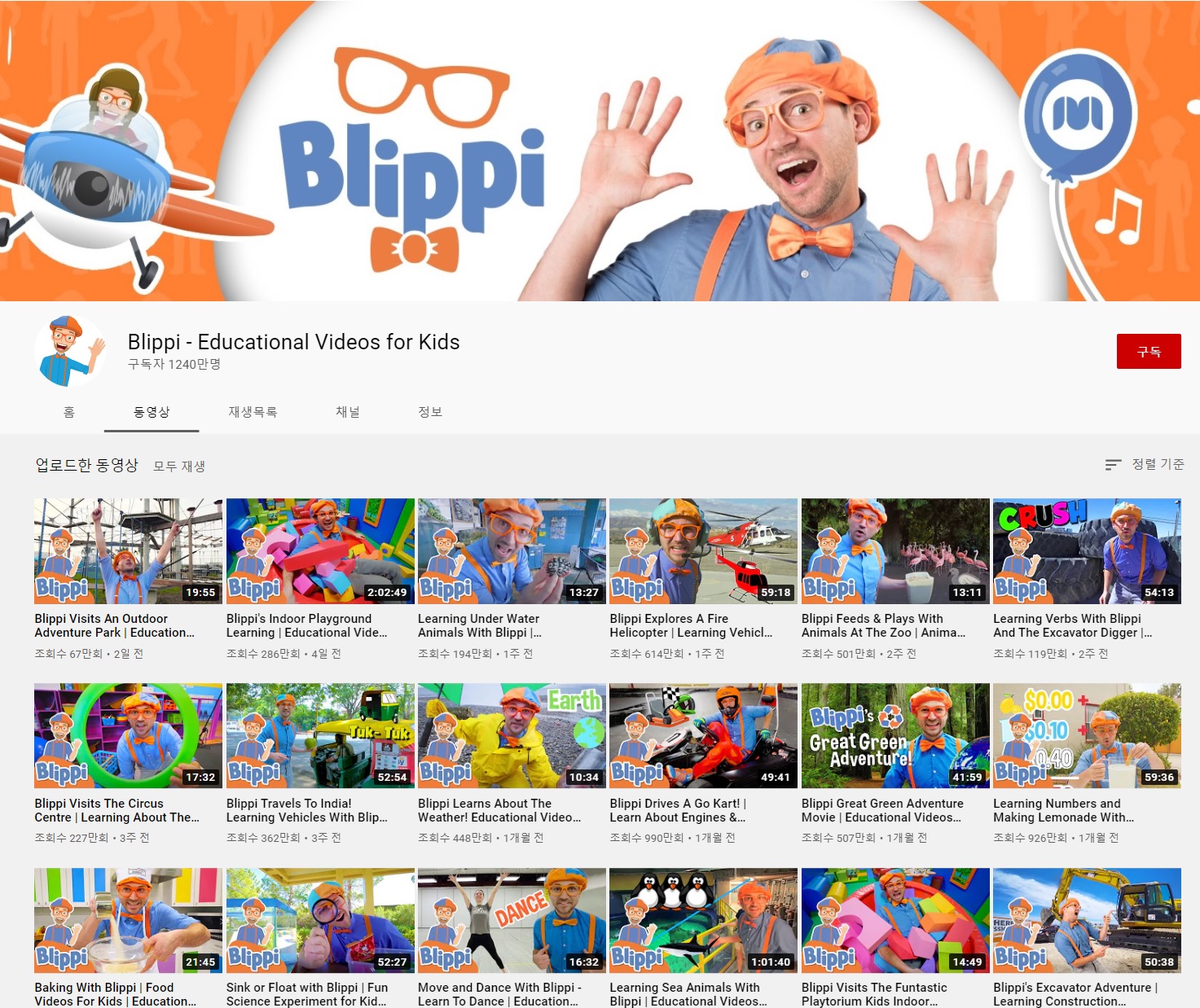8위는 아이들을 위한 교육 유튜버인 'Blippi'입니다. 블리피 채널은 어린 아이들이 궁금해할만한 주제를 아이들 눈높이에서 알려주는 채널로 약 1240만명의 구독자를 보유하고 있습니다.