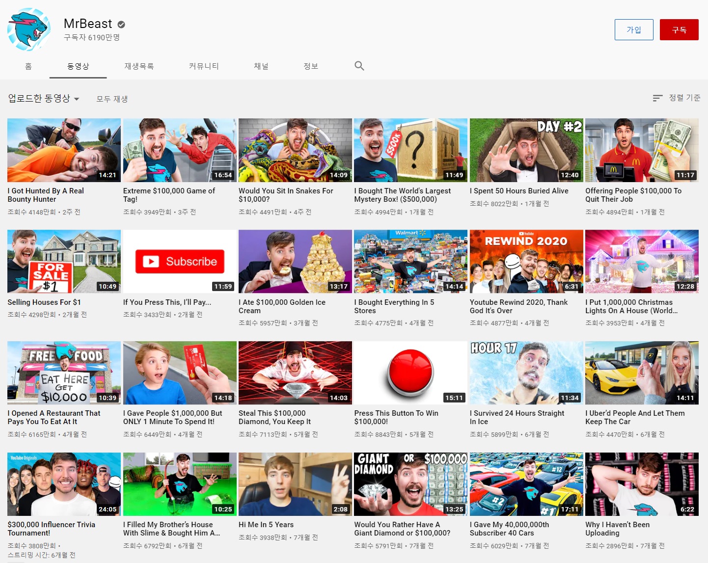 2020년 유튜버 수입 2위는 채널 'MrBeast'를 운영하는 지미 도널드입니다. 'MrBeast' 채널은 정말 기상천외한 도전이나 다양한 챌린지를 보여주는 채널로, 1달러에 집 팔기, 100만개의 크리스마스 전구로 집 꾸미기, 랜덤으로 스트리밍 방송을 하는 비제이에게 10만불 기부하기, 무인도에서 24시간동안 생존하기 등 다양한 미션을 수행하는 채널입니다. 미스터비스트의 구독자는 약 6190만명 정도로 엄청난 수를 보유하고 있습니다.