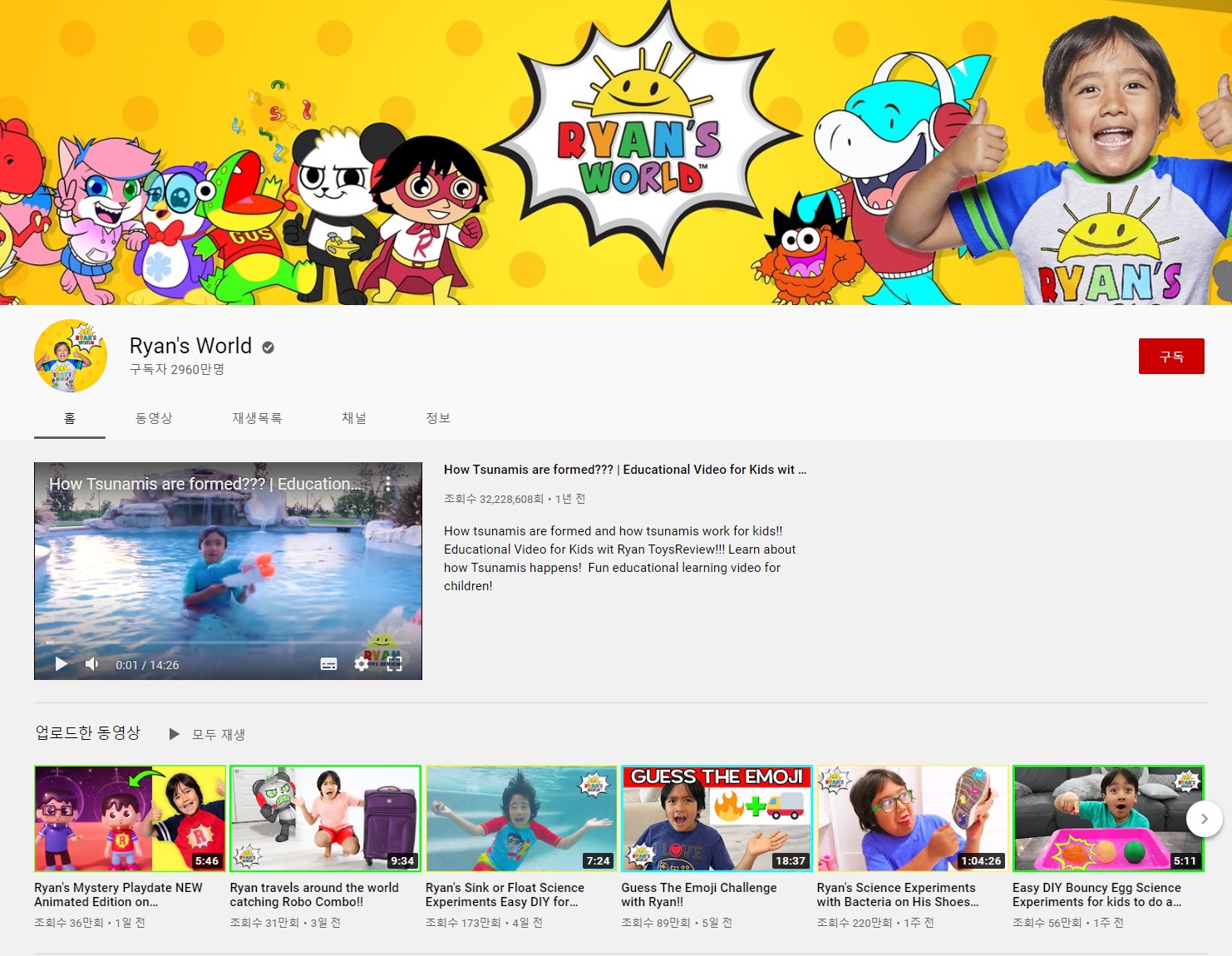 2020년 한해동안 전 세계에서 가장 많은 돈을 번 유튜버는 9살 소년인 라이언 칸지입니다. 어린 소년이 대단하죠. 라이언 칸지는 2015년 장난감 리뷰를 시작으로 유튜브를 시작하여 현재 그의 대표 채널인 'Ryan's World'는 약 3000만명의 구독자를 보유하고 있습니다.