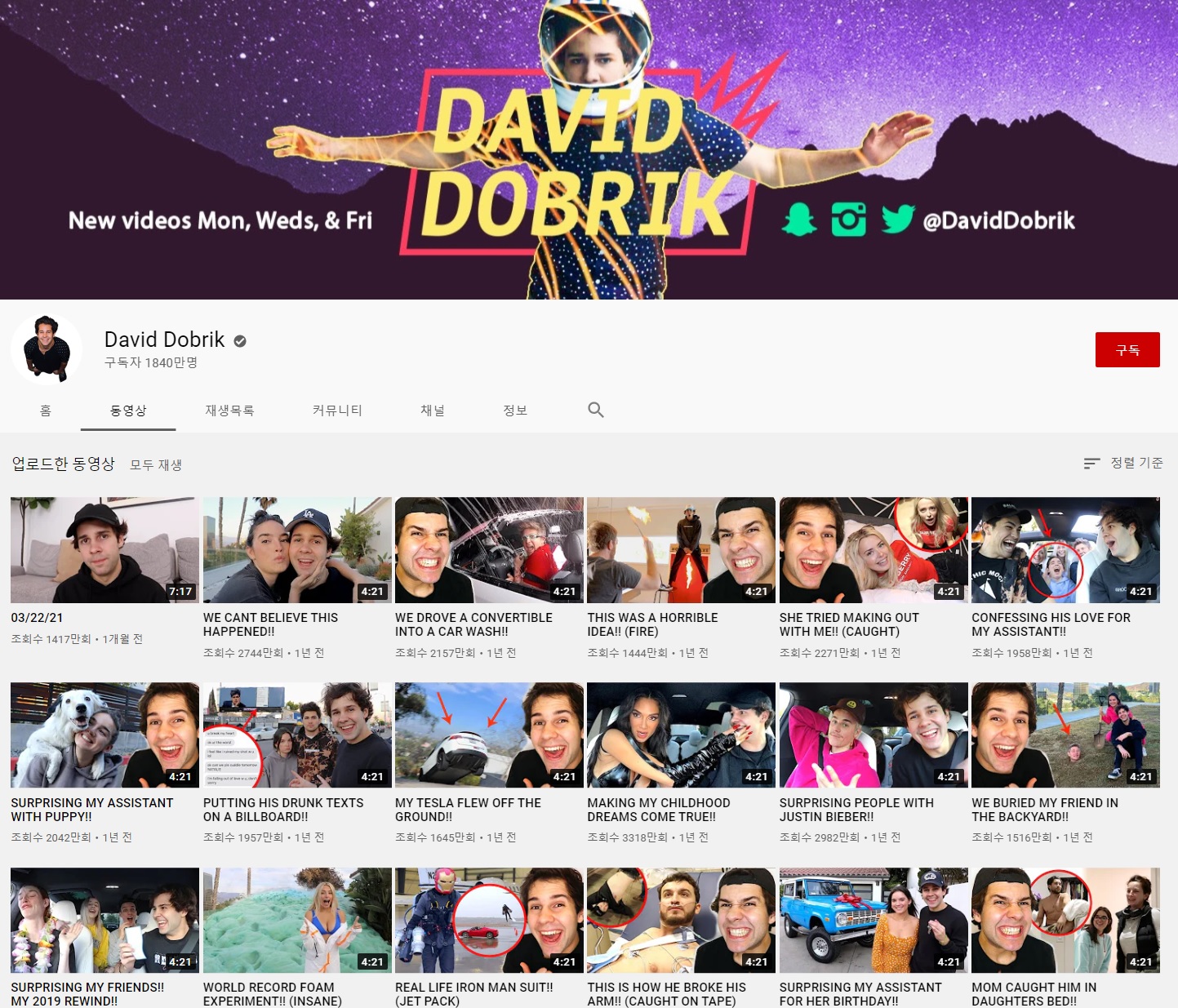 9위의 'David Dobrik' 채널은 주로 자신의 일상을 재밌게 보여주는 브이로그(VLOG) 채널입니다. 자신의 재미있는 일상을 콘텐츠로 보여주며 재치있는 입담과 밝은 에너지를 보여주는 모습이 마치 한편의 시트콤을 보는 것 같은 느낌을 들게해주죠. 현재 약 1840만명의 구독자가 즐겨보는 채널로 저스틴 비버, 찰리 푸스, 켄달 제너 등 미국의 유명 셀럽들이 출연한 적도 있을 정도로 인지도가 높은 채널입니다.