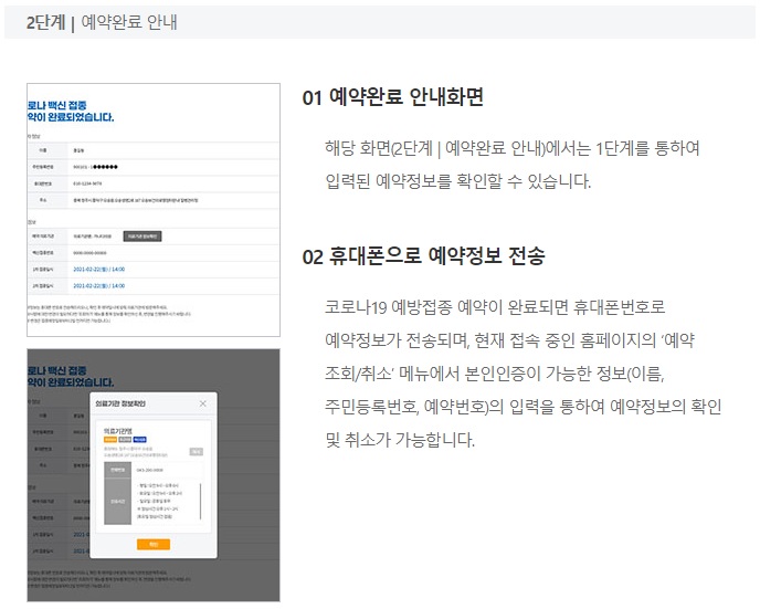 예약을 완료하면 예약완료가 되었다는 안내화면이 나오며, 휴대폰번호로 예약정보가 전송되어 본인의 예약정보를 확인하거나 취소할 수 있습니다.
