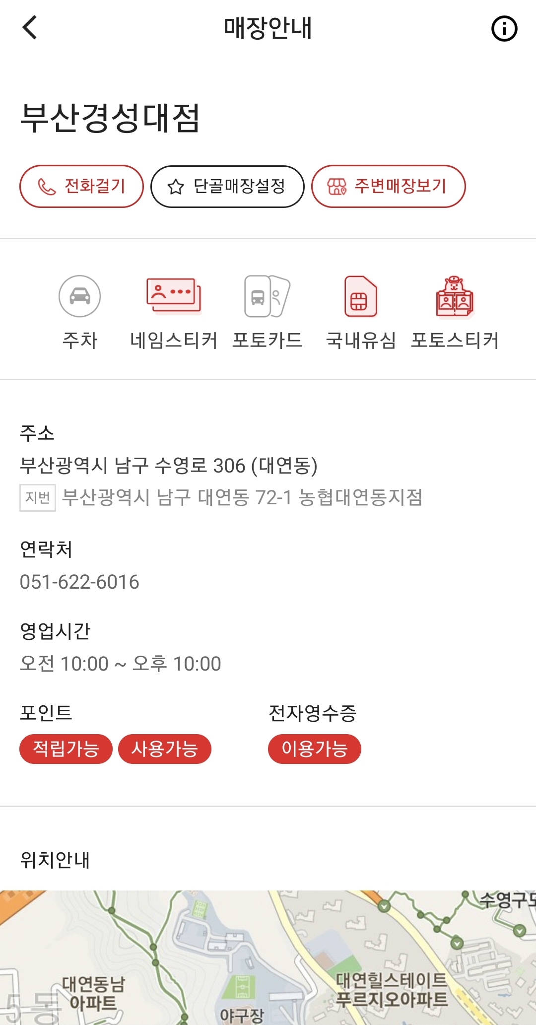 이곳에서 주소, 영업시간, 전화번호 및 포인트 적립·사용이 가능한지, 주차가 가능한지 등의 해당 매장에 관한 정보를 안내받을 수 있습니다. 혹시 매장사정으로 인해 변경된 오픈시간이 궁금하거나 매장에 내가 찾는 물건이 있는지 등을 물어보고 싶으시다면 전화걸기 버튼을 통해 매장으로 바로 전화를 걸 수 있습니다.