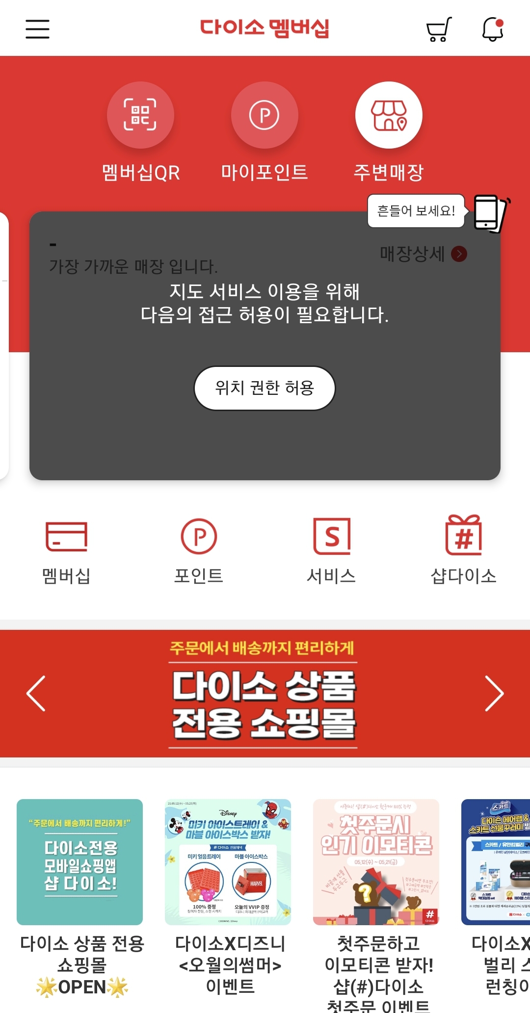 먼저 다이소 멤버십 어플리케이션에서 [주변매장] 탭을 눌러주세요.위치 권한을 허용하지 않은 분에게는 권한 허용이 필요합니다.일단 제가 사용하는 안드로이드를 기준으로 말씀드리자면<위치 권한 허용>을 누르고,