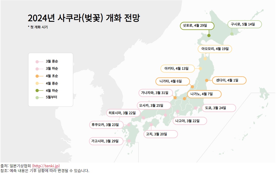 올해는 우리나라도 평년보다 이르게 개화할 거라고 하는데, 일본 역시 대부분의 지역에서 평년보다 개화가 이를 것으로 예상되고 있습니다.