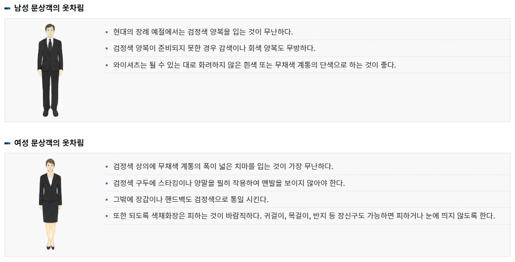 · 검정색 양복, 의복을 입는 것이 가장 무난하지만 준비되지 않은 경우라면 회색 등 되도록 어두운 무채색 계열의 옷을 입는 것이 좋습니다.
