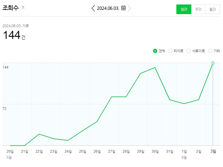 주말 사이에 다시 조회수가 100회 미만으로 줄어들었고, 월요일에 다시 144회 페이지뷰가 나왔다.